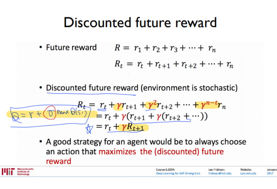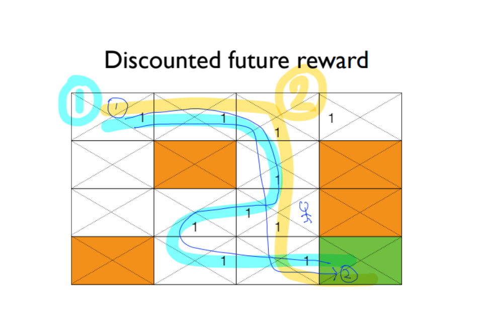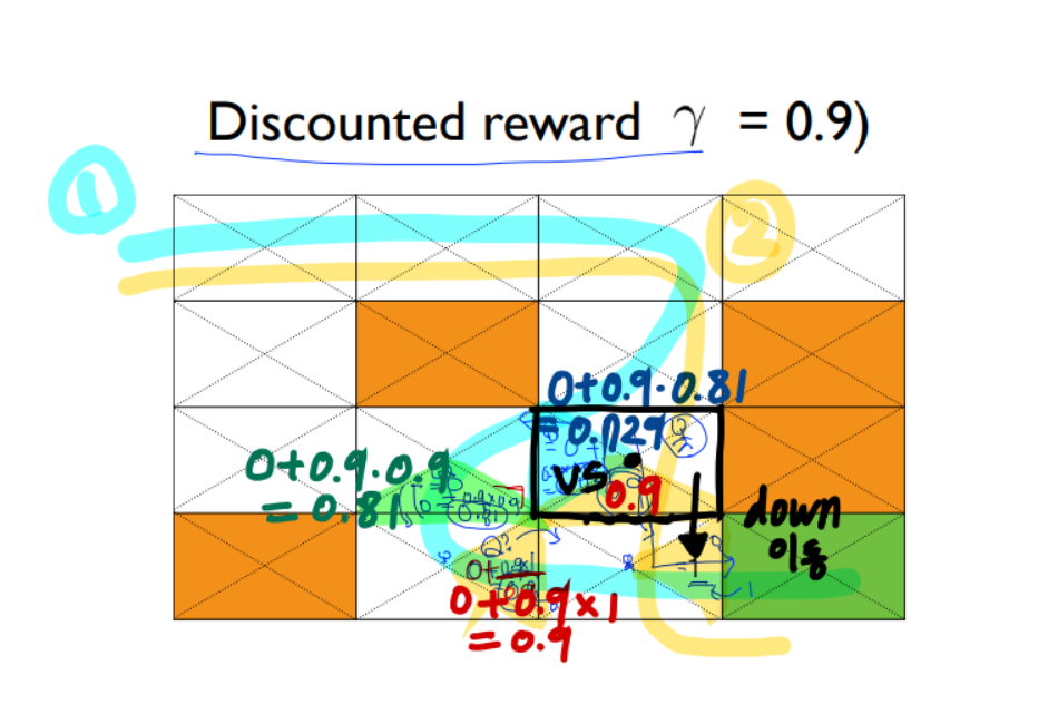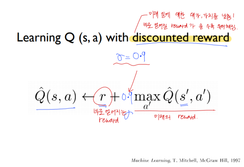 Discounted future reward, 미래 일에 대한 reward를 낮추는 방법인데, 바로 얻어지는 reward는 그대로 두고, 미래의 reward에 1보다 작은 값의 감마값을 곱하여 값을 작게한다. 슬라이드에서 감마는 0.9!