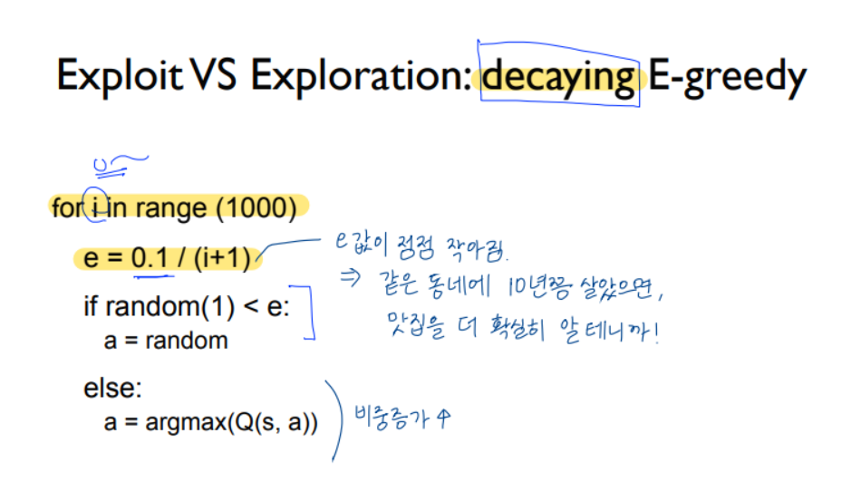 이때, decaying E-greedy를 적용할 수도 있는데, 학습 횟수가 늘어날 수록 랜덤하게 선택할 확률을 줄이는 것이다.