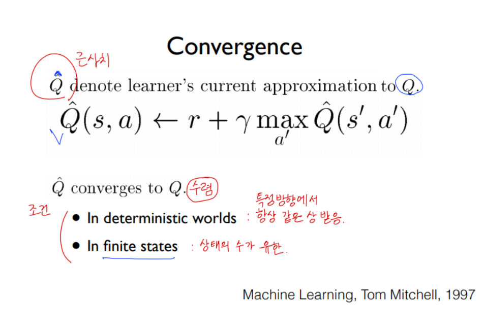 근사치이기에 Qhat으로 표기하였는데, 다음 2조건을 만족하면 이 값을 계속 업데이트 시 Q에 수렴하게 된다.
