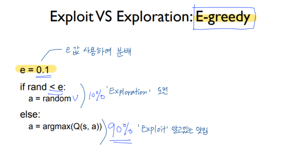 Explot과 Exploration의 채택 비중은 E-greedy 방식을 사용하여 정할 수 있다.