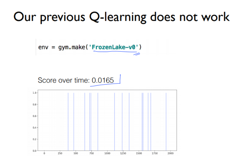 Stochastic환경에서는 Q형님이 Frozen Lake에서 미끄려져 우연히 이동한 결과값 일 수도 있기에, Q형님 말만 믿고 따라가면 위험하다. 슬라이드에서 볼 수 있듯이, 결과가 매우 매우 매우 안좋다!