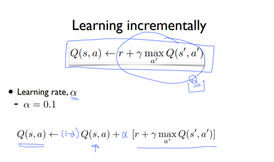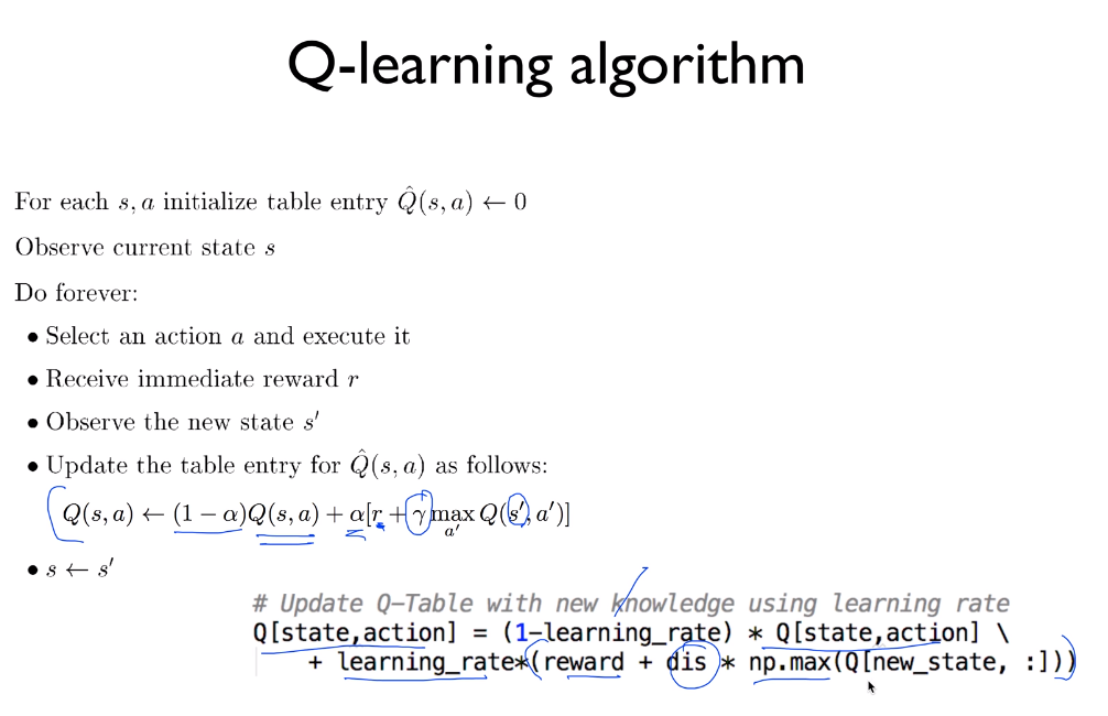 #Update Q-table Q[state, action] = (1-learning_rate) * Q[state, action] \