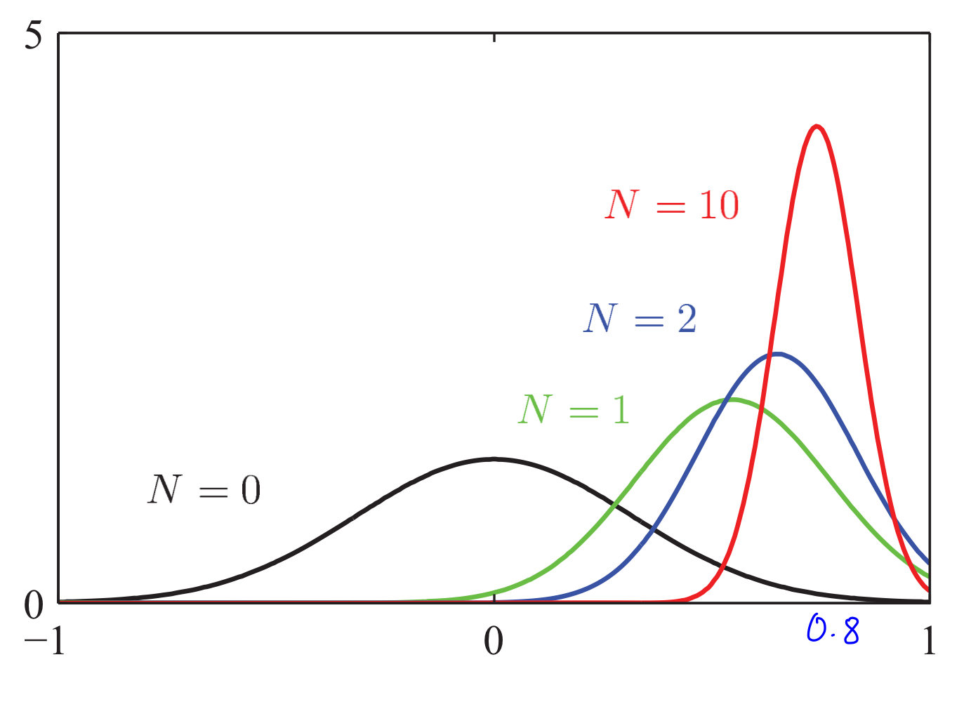 아래 그림은 $x \sim N(0.8,0.1), prior mean 0일 경우, 데이터 수에 따른 여러 posterior distribution을 보여줍니다.