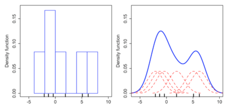 둘째, Nonparametric estimation 은 특정 함수를 가정하지 않습니다. 대신, 온전히 관찰한 데이터에 기반하여 probability distribution을 찾습니다. 데이터에 대한 가정 없이 estimation을 수행하기 때문에 관찰한 데이터에 들어맞는 distribution을 찾기 쉽습니다. 하지만, 새로운 데이터가 추가되면 분포가 달라진다는 단점이 있습니다. Kernel function은 대표적인 nonparametric estimation입니다. $f(x) = \frac{1}{N}\sum^N_{i=1}K_h(x-x_i)$