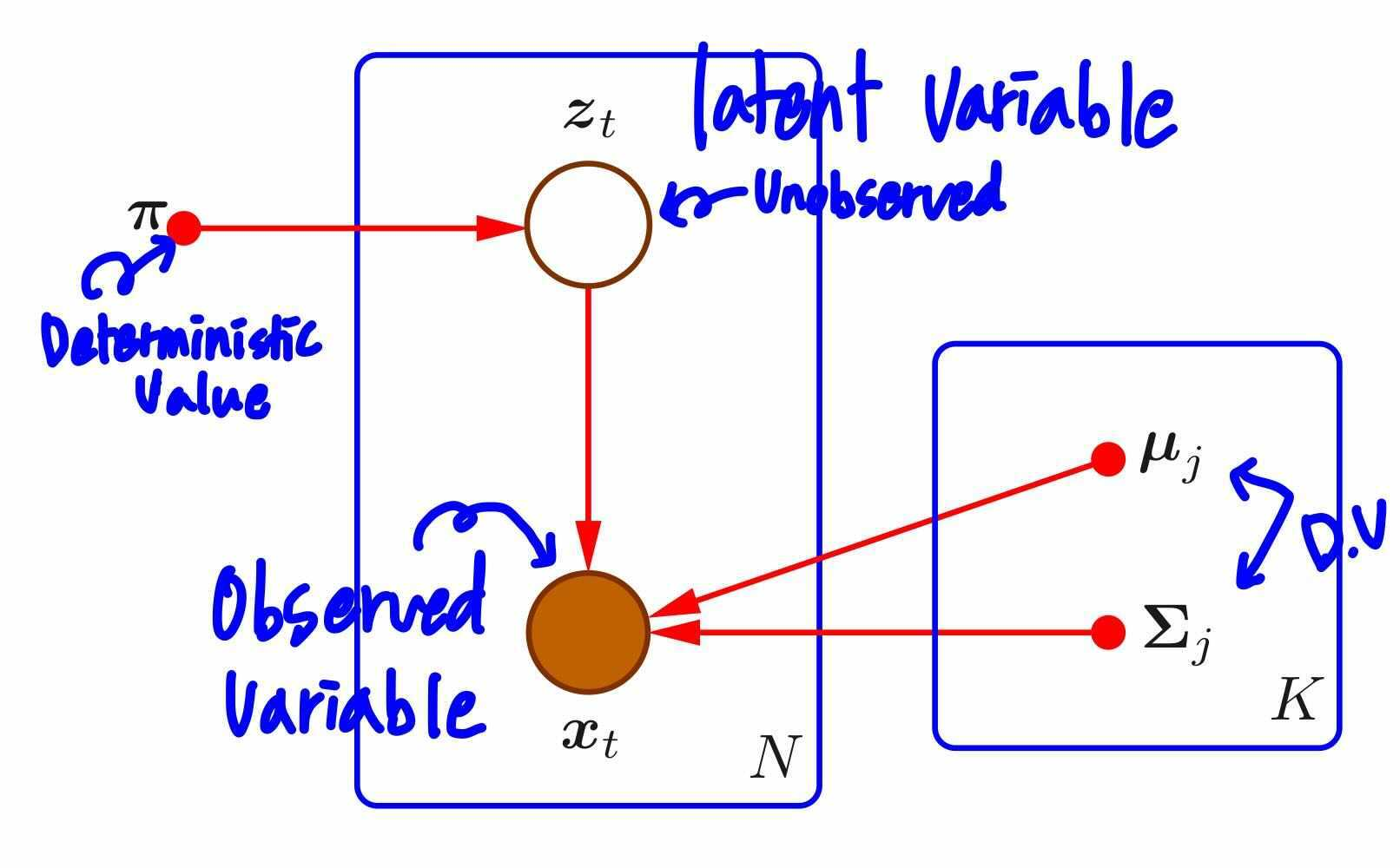 같은 내용을 graphical model로 살펴봅시다. 우선, 데이터가 k개의 가우시안 모델, 그 parameter $u_j, \Sigma_j$ 에 의해 생성되었다는 것을 확인할 수 있습니다. 그럼 상단의 $z_t$는 무엇일까요? 바로 앞선 설명에서 데이터가 모델에 속할 확률인 $\pi$를 parameter로 갖는 변수입니다. 이때, $z$는 latent variable(잠재변수)에 해당합니다. 위키백과의 설명에 따르면, 잠재 변수는 구성개념이 직접적으로 관찰되거나 측정이 되지 않는 변수를 의미합니다. 우리의 데이터 $x$는 관찰된 대상이지만, 각각의 데이터가 어떤 모델에 속해있는지 latent variable $z$는 모릅니다. MoG에서는 latent variable을 사용하므로써, 자연스럽게 여러 모델이 존재할 경우 데이터의 확률을 표현할 수 있습니다.