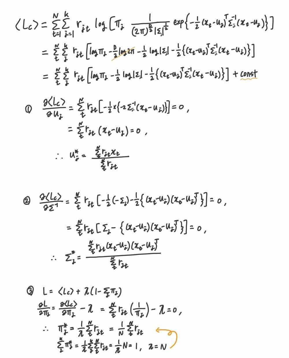 마지막 $\pi_j$ 를 구할 때는, $\sum_j^k \pi_j = 1$이라는 제약 조건이 있으므로, Lagrange를 사용합니다.