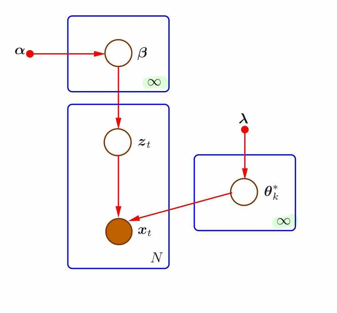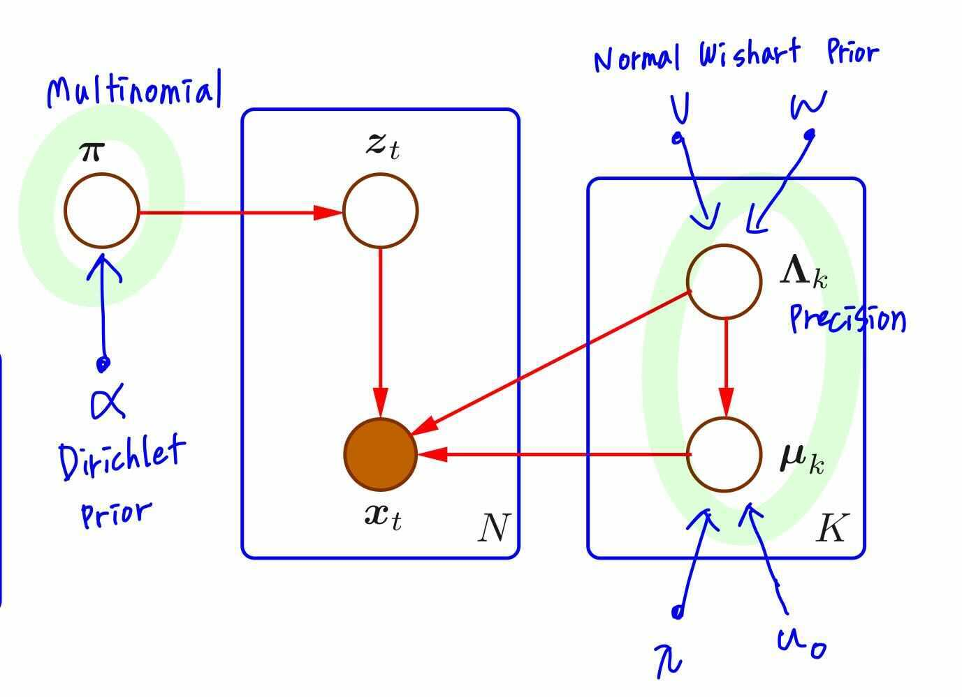 Bayesian MoG는 parameter $\{u_j, \Sigma_j, \pi_j\}$를 random variable로 가정합니다. 이때 conjugate prior를 사용하여 multinomial인 $\pi$에는 Dirichlet distribution을, multivariate gaussian인 $u_j, \Sigma$를 위해선 Normal-Wishart distribution을 사용합니다.