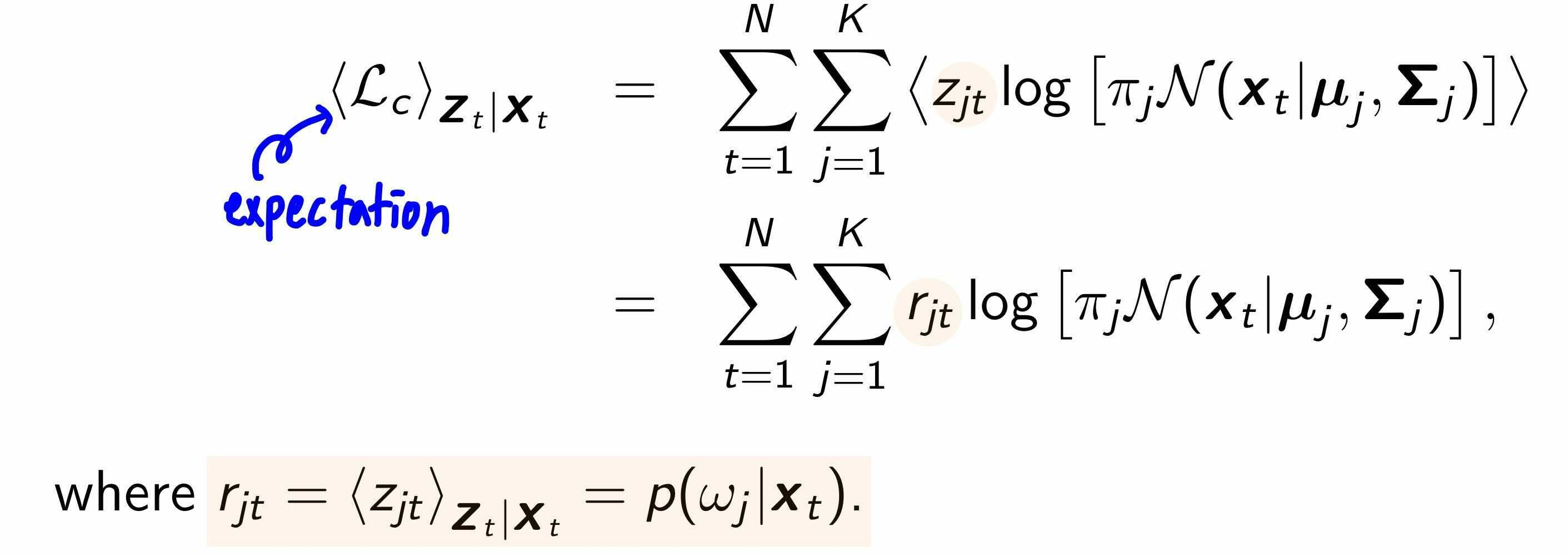 $z_t = [0,\cdots,1,\cdots,0]^T$ 로 데이터 t가 속한 모델 j의 index에 1, 나머지는 0으로 binary value로 표현합니다. 그럼 $p(z_t) =\prod_{j=1}^K \pi_j^{z_{jt}}$ 로 나타낼 수 있고, $z_t$를 안다면(즉, 데이터가 속한 모델을 안다면), 데이터의 확률도 다음과 같이 표현할 수 있게 됩니다. $$p(x_t|z_t) = \prod_{j=1}^K N(u_j, \Sigma_j)^{z_{jt}}$$