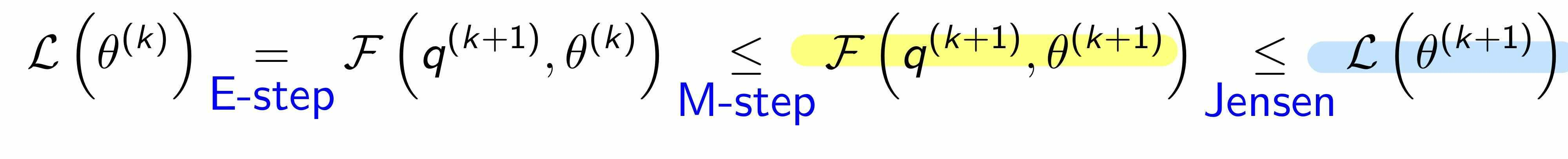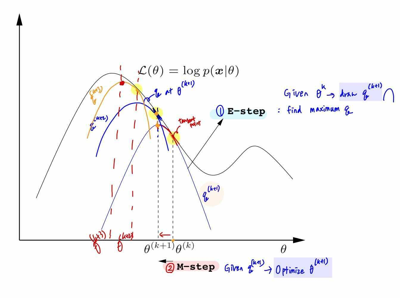 M step에서는 새롭게 업데이트 된 $q^{k+1}$를 바탕으로 paramter를 $\theta^{k+1}$로 최적화 합니다.