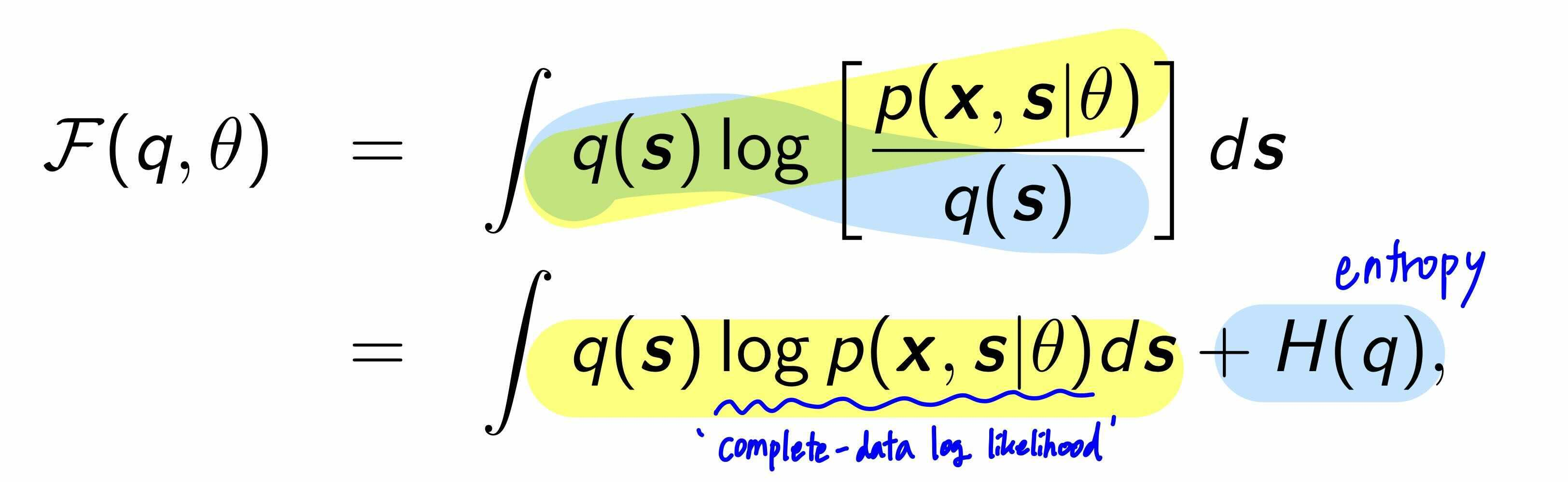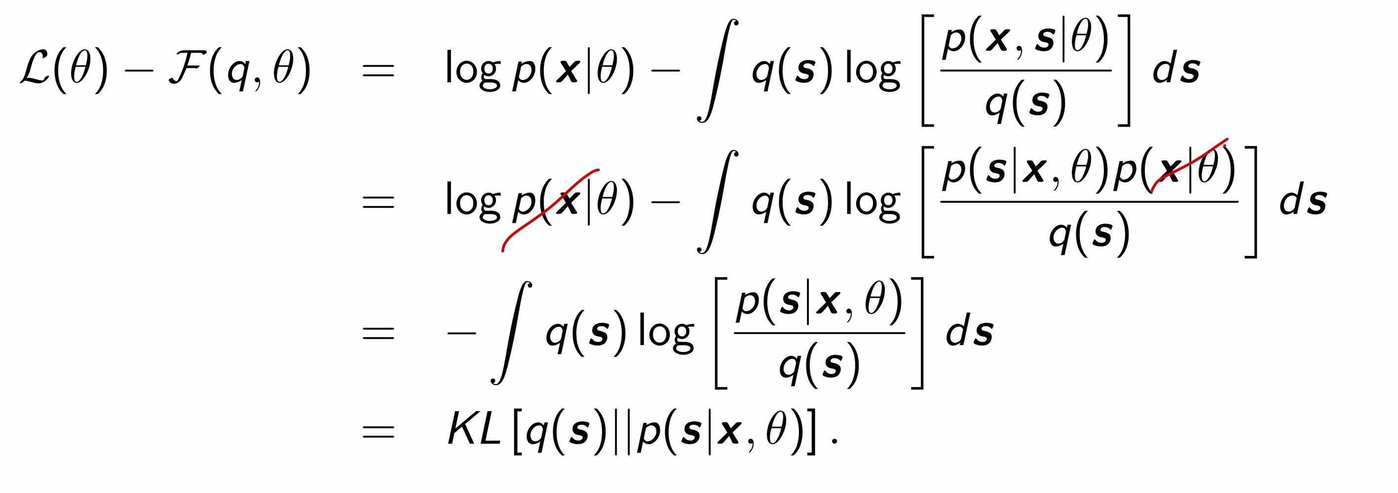 $L(\theta) - F(q, \theta) = KL[q(s) | p(s|x, \theta)]$ 가 됩니다.