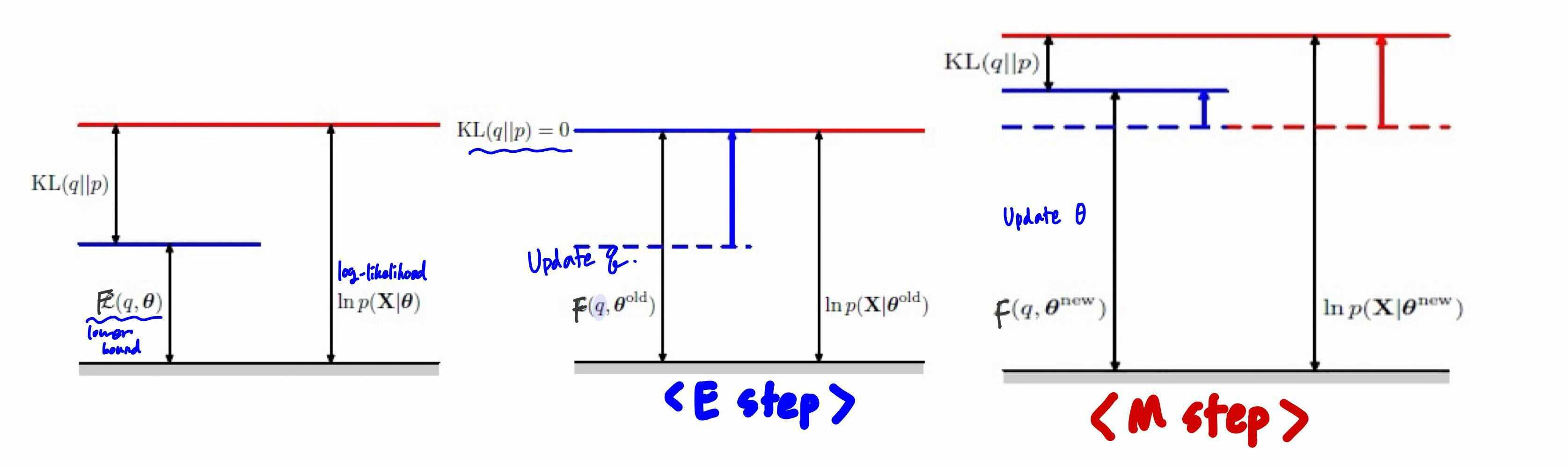 Gibb's inequality에 따라 항상 KL은 0보다 크거나 같으며, $q(s) = p(s|x,\theta)$일 경우, $KL[q(s)|p(s|x,\theta)]=0$ 입니다. 따라서 현재의 parameter의 상황에서 lower bound를 최대화 하기 위해선, $q(s) \leftarrow \text{posterior distribution : }p(s|x,\theta)$으로 업데이트 해야합니다.