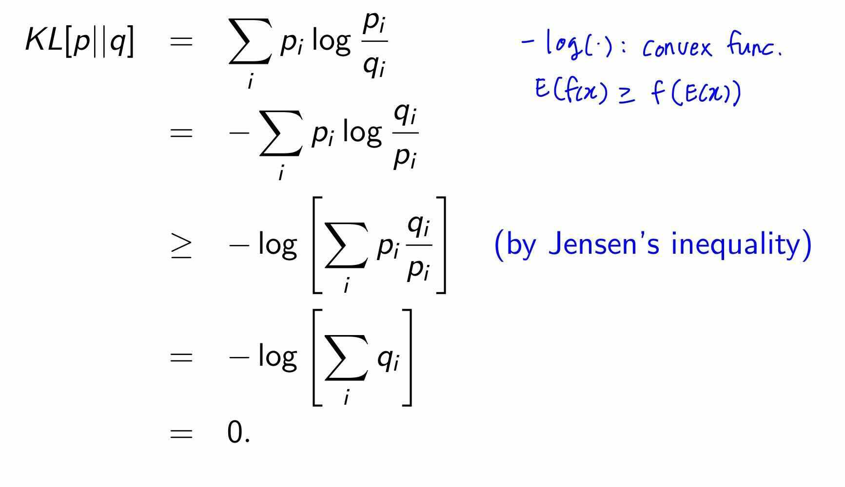 KL divergence 가 항상 0보다 크거나 같으며, p=q일때 0이라는 이론입니다. KL은 두 분포의 차이를 측정하는 데, 같은 분포 ($p=q$)라면 차이는 당연히 0일 것입니다.