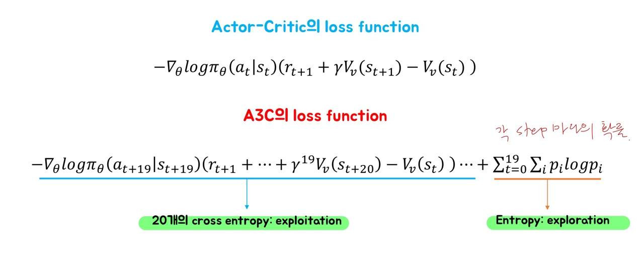 --> multi-agent가 하나의 global network를 업데이트하기에, 하나의 에이전트가 global network 업데이트 할 동안 나머지 agent는 여러 스텝을 진행하면서 업데이트 할 타이밍을 기다림. 이때, 모든 step마다 loss function을 구해서 더한 것으로 업데이트함. (ex. 20step -> 20개의 loss function을 더한것으로 업데이트)