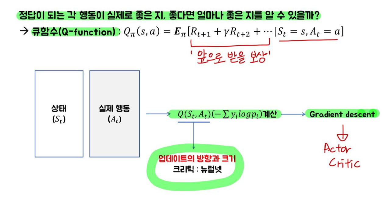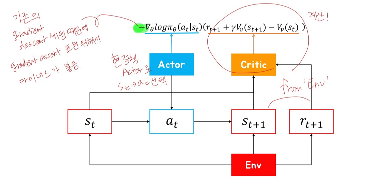 이 값으로 Critic '가치신경망' 통해 시간차에러를 구함. 이 시간차 에러는 가치신경망을 업데이트하는 데 사용되며,