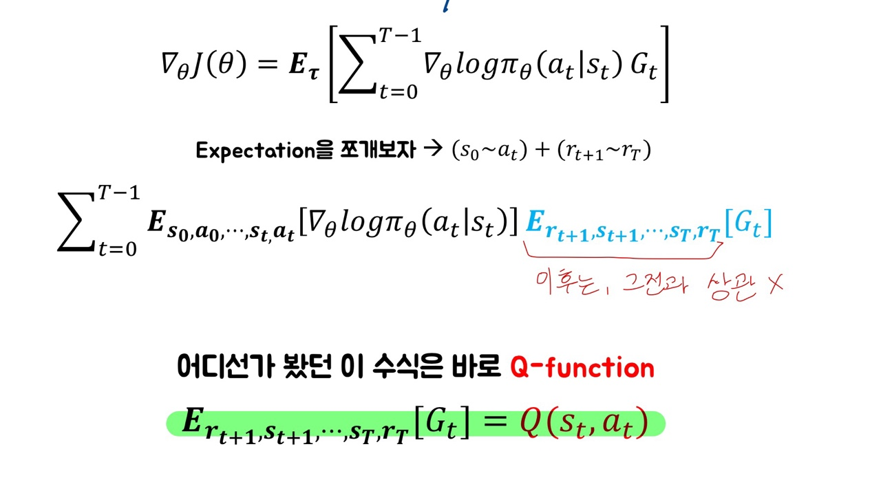 Reinforce알고리즘에서 유도한 미분값을 쪼개보았을 때, Q함수를 발견가능.