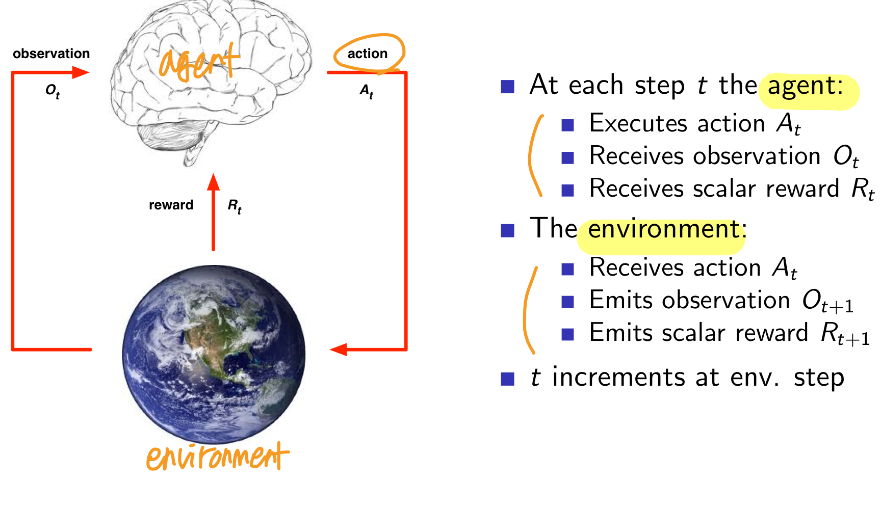 environment state는 주로 agent가 알지 못한다. agent state는 agent가 다음 action을 선택할 때 사용하는 정보이다.