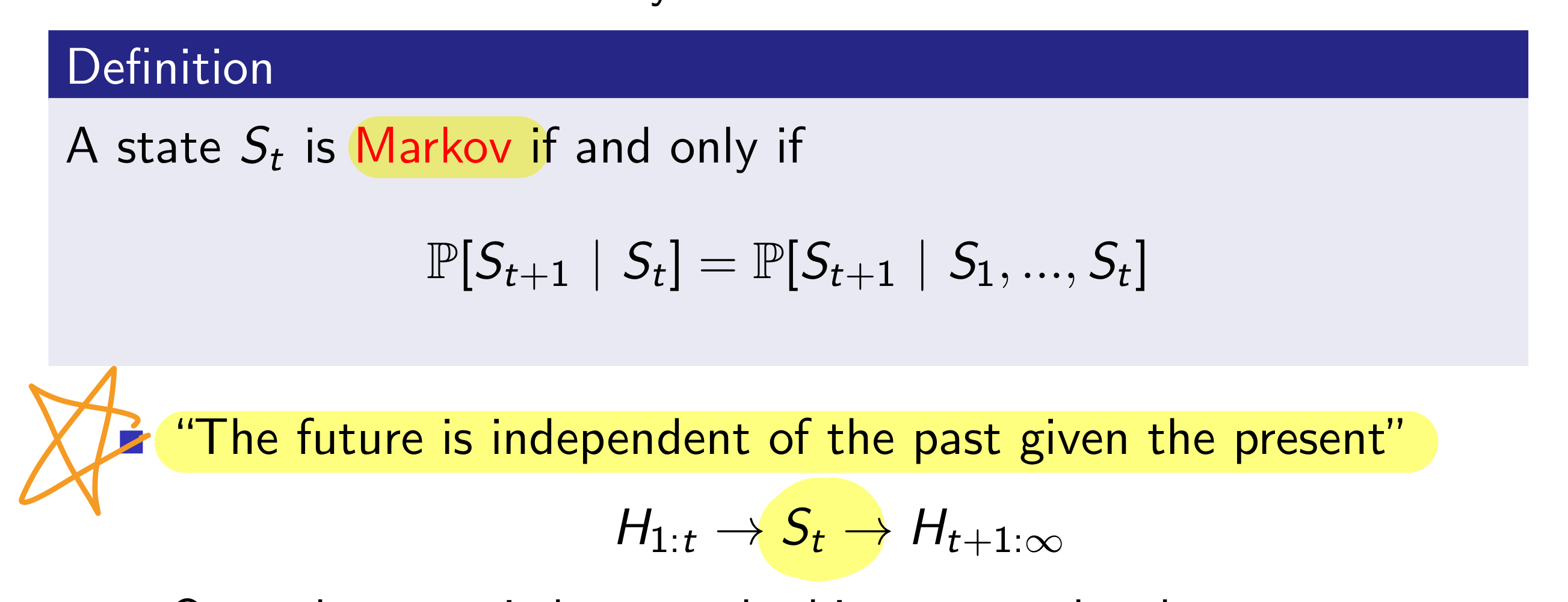 Markov의 정의는 특정 state가 과거의 history 정보를 다 아우를 수 있을 때를 말한다.