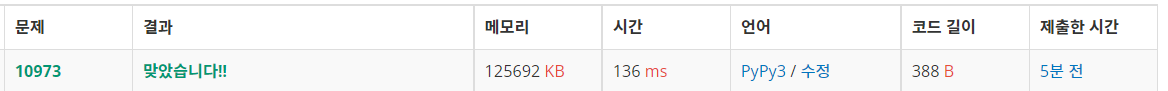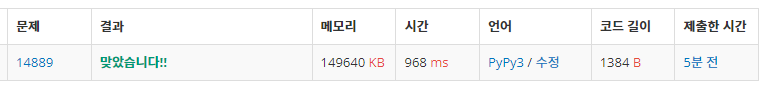 문제링크 https://www.acmicpc.net/problem/14889 14889번: 스타트와 링크 예제 2의 경우에 (1, 3, 6), (2, 4, 5)로 팀을 나누면 되고, 예제 3의 경우에는 (1, 2, 4, 5), (3, 6, 7, 8)로 팀을 나누면 된다. www.acmicpc.net 코드 1 2 3 4 5 6 7 8 9 10 11 12 13 14 15 16 17 18 19 20 21 22 23 24 25 26 27 28 29 30 31 32 33 34 35 36 37 38 39 40 41 42 43 44 45 46 47 48 49 50 51 52 53 54 55 56 57 58 59 60 61 62 63 import sys input = sys.stdin.readline n = int(i..
