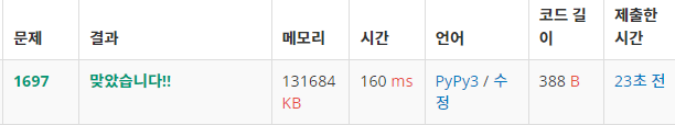 문제링크 https://www.acmicpc.net/problem/11727 11727번: 2×n 타일링 2 2×n 직사각형을 1×2, 2×1과 2×2 타일로 채우는 방법의 수를 구하는 프로그램을 작성하시오. 아래 그림은 2×17 직사각형을 채운 한가지 예이다. www.acmicpc.net 코드 1 2 3 4 5 6 7 8 9 10 11 12 13 import sys input = sys.stdin.readline n = int(input()) d = [0]*1001 d[1]=1 d[2]=3 for i in range(3, n+1): d[i] = (d[i-1] + 2*d[i-2])%10007 print(d[n]) cs Point - 다이나믹프로그래밍으로 접근 Subproblem 만족 & Optimal S..